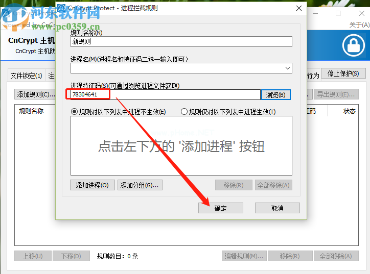 5.点击打开按钮后,会自动获取流程的特征码。如下图所示,我们可以通过点击OK按钮来创建这个拦截规则。