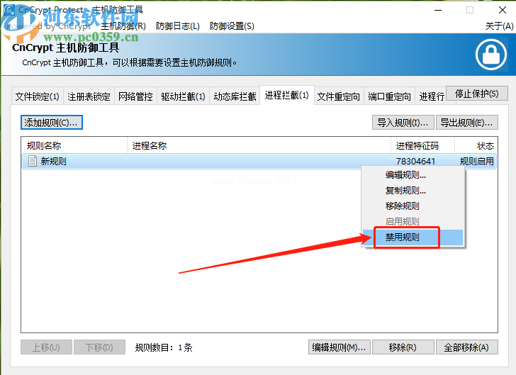 6.拦截规则创建完成后,启用状态表示拦截正在进行。如果要取消拦截,请右键单击选择禁用的规则。
