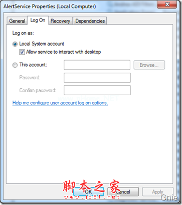 选中服务属性中的“允许服务与桌面交互”,以便AlertService可以与桌面用户交互。