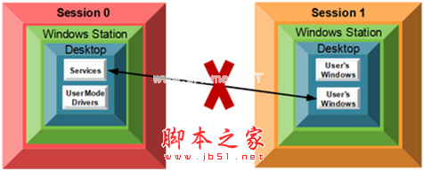 但是这种操作方式增加了系统安全风险,因为服务是通过增加用户权限来运行的,而应用往往是由不具备管理员身份的普通用户来运行,危险性明显。从Vista开始,Session 0仅包含系统服务,而其他应用程序通过单独的会话运行,将服务与应用程序隔离开来并提高系统安全性。如下图所示: