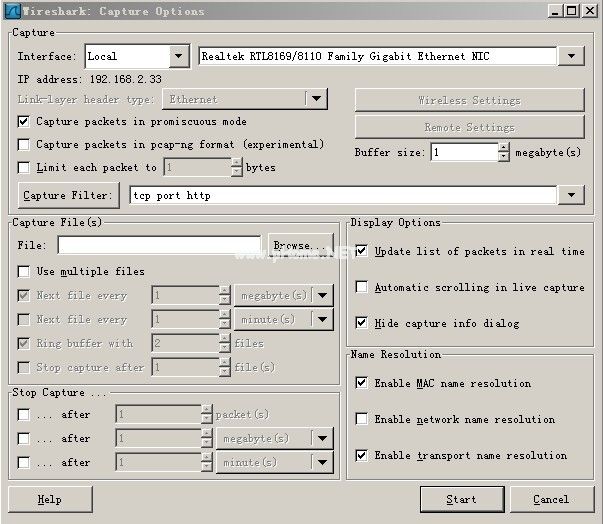 图1设置捕获选项。一般读者只需要选择顶部下拉框,选择合适的Device,然后点击“Capture Filter”,这里选择“HTTP TCP端口(80)”,然后点击上图中的“Start”即可开始抓取包。