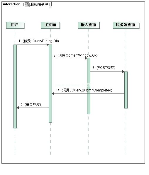 如上图所示,这基本上就是JQueryDialog完整的逻辑流程。1.当用户在模态窗口中单击提交按钮时,JQueryDialog。调用Ok()函数,对应用户提交的事件。2.有了OO的概念,JQueryDialog。Ok()实际上是一个虚函数,它的逻辑封装在子窗口ContentWindow中。Ok(),是我从FCKEditor借来的。代码如下所示:JS代码复制如下: var jQuery Dialog={//Summary Submission/Summary///备注/备注ok3360 function(){ var FRM=$(' # JD _ iframe ');if(frm[0]. content window . ok()){ JqueryDialog。close();} else{ frm[0]。焦点();} } };因此,从Iframe到Dialog的每个子页面都必须定义父窗口可以调用的函数Ok,并返回true或false来通知父窗口Dialog是否关闭。3.通常ContentWindow包含服务器的处理逻辑,因此需要通过POST与服务器进行交互。因为ContentWindow本身不包含“提交”按钮,所以如果要开机自检,必须在ContentWindow中写入submit()。Ok()。4.最后,服务器逻辑执行完成,控制权需要返回给Dialog。所以我封装了JQueryDialog。SubmitCompleted(),它包含Dialog执行最终逻辑处理的三个参数:是否弹出消息及其内容、是否关闭Dialog以及是否刷新父窗口。该功能还得益于FCKEditor,如下图:JS代码复制代码如下: var jquery dialog={//汇总提交完成/summary ///param name='alertMsg '弹出提示。如果该值为空,/param///param name=' isclosedialog '是否关闭对话框/param///param name=' isfreshpage '是否刷新页面(关闭对话框为真时有效)/param submit completed : function(alertMsg,isCloseDialog,isfreshpage){ if($)。装饰(alertMsg)。长度0){ alert(alertMsg);} if(isCloseDialog){ JqueryDialog。close();if(IsRefreshPage){ window . location . href=window . location . href;} } } };5.结果会做出响应并呈现给用户。开发日志JS的模态窗口在网上数量很大。参考了一些之后,我最终决定把它纳入我众多“原创项目”中的一个。毕竟,在WEB开发中,窗口仍然被非常频繁地使用。从版本发布日志可以看出,这个东西已经修修补补了一段时间了,现在基本上是一个初始版本,但我会不断完善。在这个过程中,我有机会参考和学习JQuery、Fckeditor等大型JS项目的框架,收获颇丰。同时我也再次经历了JS多浏览器兼容调试的痛苦,但为什么不呢?玩得开心。谈项目的实现:首先,基于浮动DIV。然后是iframe子页面,我觉得用户和开发者使用iframe最方便。模态窗口的内容就是子页面的内容,模态窗口的切换就是子页面的切换。在确定了框架结构之后,有一些处理细节,比如子页面的事件之间的关系,模态窗口的关闭,这些我都得到了FCKEditor很大的帮助。参考它的实现,您可以在DEMO中查看详细的代码。为了多浏览器的兼容性,一些常见的DOM方法被封装。增加了一些自定义配置,如边框颜色和背景颜色。同时考虑到方便易用,使用CSS来达到效果,项目中不使用图片。好的,前面提到了,这是一个比较基础的版本,以后我会继续完善。欢迎大家使用,并提出宝贵建议。(2009年6月1日,吴剑)。虽然项目的开放项都交了,但是我开始对JQuery有了好印象,放下了,所以我决定正式把这个项目改名为JQueryDialog。这次更新,代码完全基于JQuery框架,应用了命名空间,让JS看起来有点OO。同时修改客户端的ID,增加jd_ prefix避免冲突,修改拖拽的核心函数,支持多浏览器。