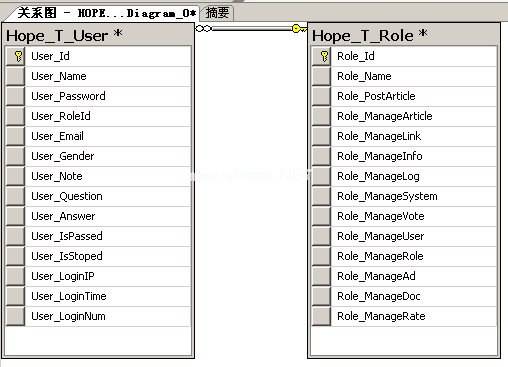 角色用户表,其中Hope_T_User中的User_RoleId与Hope_T_Role的Role_Id关联,表中的字段都是简单通用的英文,所以不做详细说明。