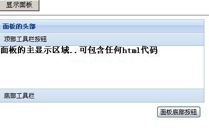 通过这篇文章,我们可以了解到以下内容:1。创建一个简单的面板Ext。第二小组。制作一个可拖动的面板Ext。第三小组。使用选项卡面板3。使用Ext。构建一个简单的布局(用一个小例子总结本文的所有内容)。面板是ExtJs控件的基础,很多控件都是在面板的基础上进行扩展的,也可能和其他控件有关系。面板由工具栏、底部工具栏、面板头、面板尾和面板主区域组成。该类还提供面板扩展和关闭等功能。并提供了一些可重用的工具按钮,给我们灵活的控制面板。面板可以放在任何其他容器中,面板本身就是一个容器,因此面板也可以包含其他组件。面板的类名是Ext。面板,它的x类型是Panel。请参见以下示例来显示面板的各个组件://普通面板功能面板(){ var panel=new ext . panel({ render to : ' panel ',title : ' head ',width:400,height:200,html:'h1面板的主显示区域可以包含任何html代码/h1 ',tbar 3360[{ text : ' top toolbar button ' }],bbar 3360[{ text 360);} } ] });}以上代码就不详细介绍了,但特别说明的是renderto :‘panel’,负责将panel绑定到一个div图层,panel就是div的ID。Div id='panel'/div代码执行将显示以下效果: