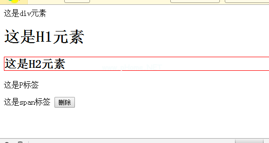 var del _ tag=function(){ var tag=null;返回{ get : function(e){ tag=e;},del:function(){ $(标记)。移除();} } } var dt=del _ tag();//将del_tag赋给dt函数get _ tag(e){ varele=e . target;$(ele)。css('边框',' 1px实线红色')var标记名=ele.tagName//定义一个标签数组来存储我们想要删除的对象。var tagarr=['span ',' h1 ',' H2 ',' H3 ',' H4 ',' H5 ',' h6 ',' p '];//判断我们点击的对象是否在我们的数组中声明,可以删除。If (tagarr。(标记名)-1)的索引{//Call dt.get()参数是get_tag函数的事件参数值的目标dt . get($(ele));}} $ ('# del ')。click(function(){//这里,因为闭包是创建的,所以保存了我们上次点击的对象。//所以这里我们可以直接调用dt.del()来删除对象dt . del();})看效果: