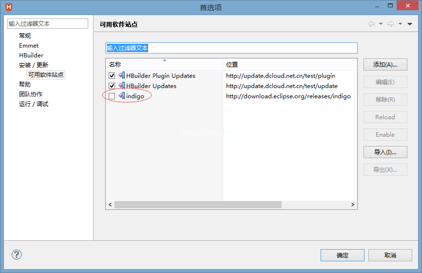 2.检查indigo(注意:检查时,HBuilder会在启动时检查安装在indigo中的插件是否已经升级,这样会导致软件启动太慢或者启动后长时间比较卡,所以请在安装jdt后再次移除此检查)如下图所示。