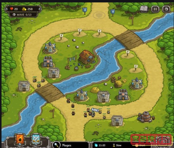 炮塔首选,火雨也是要用的,后面用得更频繁。这一关比较简单,一个路口,虽然这关简单,但是策略还是要明确,就是集中火力打击敌人,我们选择这3个位置布置防守,有个炮塔基本就足够了,可以炮台 魔法塔 箭塔组合,双箭塔也可以,关键是把炮放中间,发挥火炮的最大优势,小兵就摆3个火力的中间位置,挡住来犯之敌后,3个火力点就有足够的时间进行打击,轻松搞定!!