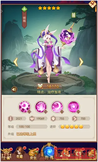 主动技能:【镇妖塔】对敌方前两排全体造成105%物理伤害,30%概率附加(嘲讽)状态,持续1回合,若自身速度大于目标,则概率提升到50%
