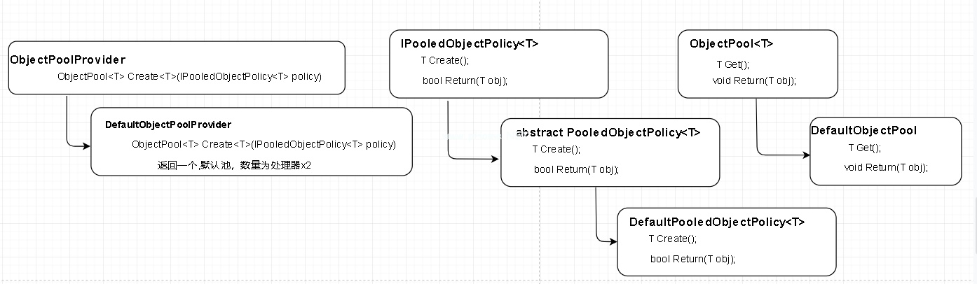 该组件的主要目的是将对象保存到对象池中,使用时直接获取,无需重新创建,从而实现对象的重用。但是有一个问题。如果起初对象池中没有对象,或者获取的对象数量大于对象池中的数量,该怎么办?当对象池中的对象数量不足时,此时需要通过策略创建对象来获取对象。至于如何创建对象,你需要实现它。如上所示,Policy有一个默认实现DefaultPooledObjectPolicy,它是由新的T()创建的。