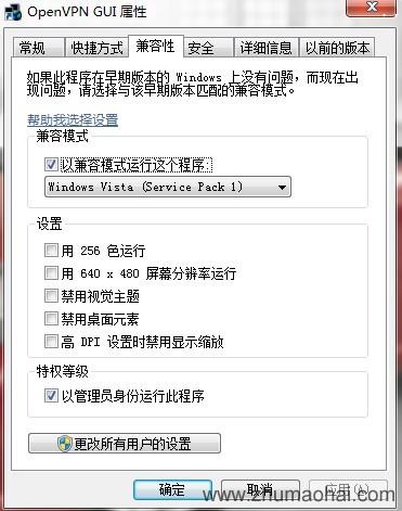 双击安装程序,安装完成后,右键属性桌面openvpngui快捷方式,选择兼容性为windows vista (service pack1),勾选“以管理员身份运行此程序”。选择如图设置: