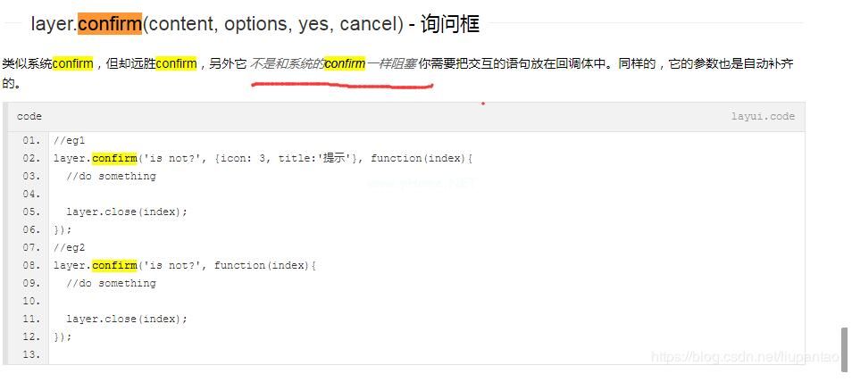 2.问题分析:查看layerUI的API,发现系统的确认是线程阻塞,而layer.confirm是非阻塞