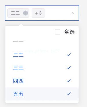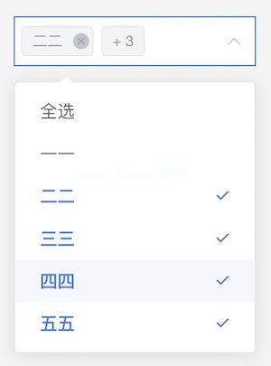 导出默认{ data(){ return { selected array :[],options :[{ name : }'一一,标签为: '一' },名称为: '二二,标签: 'tow' },名称: '三三,标签: '三' },名称: '四四,标签为: '四' },名称为: '五五,label: 'five' } ] } },methods : { selectAll(){ if(this。选择一个数组。长度这个。选项。长度){这个。selectedarray=[]this。选项。map((item)={ this。选择一个数组。推送(项目。name)})这个。选择一个数组。' unshift('全选)} else { this.selectedArray=[] },changeSelect(val) { if(!val.includes('全选)瓦尔。长度===这个。选项。长度){这个。选择一个数组。' unshift('全选)} else if (val.includes('全选)(瓦尔。长度-1)这个。选项。长度){这个。selectedarray=this。选择一个数组。filter((item)={ return item!=='全选}) } },removeTag(val) { if (val==='全选){ this.selectedArray=[] } } }}看看效果图: