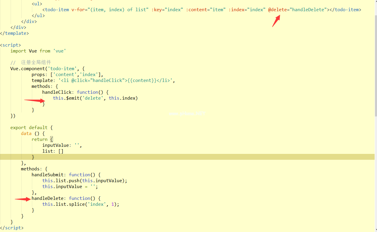 下图显示子组件通过$emit()方法传递删除事件,父组件在捕获删除事件后执行handleDelete()方法