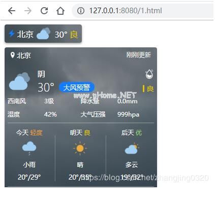 div id=' weather-float-he '/div脚本类型=' text/JAVAScript ' WIDGET={ FID : ' KbZq 7 JD mhf ' }/脚本脚本类型=' text/JAVAScript ' src=' http :https://apip。天气数据。com/float/static/js/r . js?v=1111 /脚本效果: