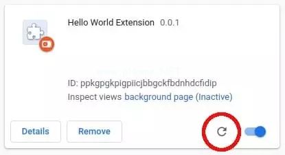 chrome _ URL _ overrides ' : { ' new tab ' : ' tab . html ' }最后,您需要重新加载扩展才能使更改生效。你可以通过点击Chrome扩展页面上Hello World扩展的重载图标来实现。