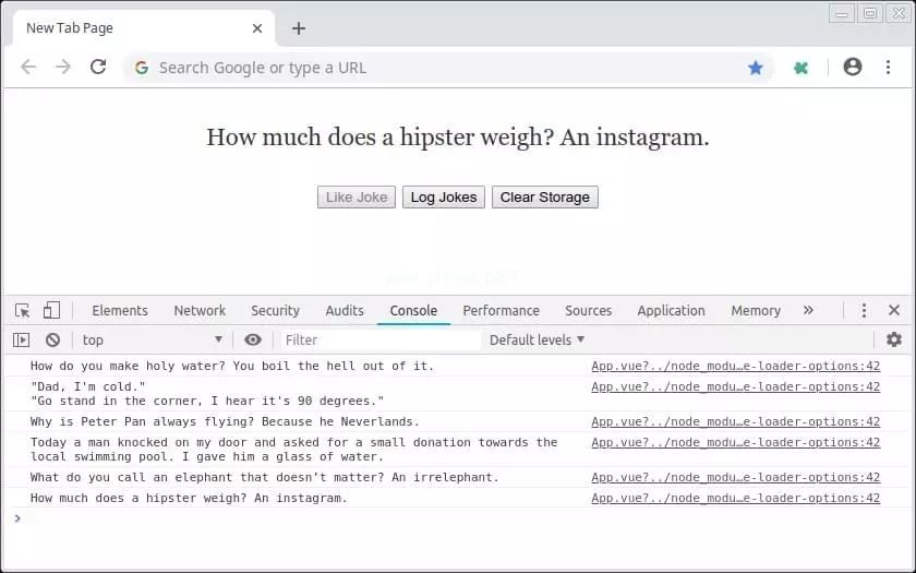 div v-elsep class=' Joke ' { { Joke } }/pbutton @ click=' like Joke ' : disabled=' like button disabled ' like Joke/关于button button @ click=' log chains ' class=' BTN ' log chains/button button @ click=' clear storage ' class=' BTN ' clear storage/button/div。请注意,我们将按钮状的禁用属性绑定到Vue实例上的数据属性,以确定其状态。这是因为用户不应该喜欢一个笑话很多次。
