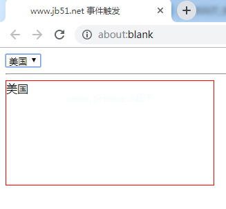 !titlewww.jb51.net事件触发/title meta charset=' utf-8 '/头体选择id='sel '选项中国/option选项美国/option选项日本/option选项韩国/option/选择HR div id=' div ' style=' width :300 px;高度' :150像素;border:solid 1px红色;/div脚本类型=' text/JavaScript ' var sel=document。getelementbyid(' sel ');var div=文档。getelementbyid(' div ');//设置变化事件后处理函数出售。onchange=function(){ div。innerhtml=sel。选项[sel。selectedindex].文本;//拿到选中的选择权的文本填充到差异里} //触发变化事件的函数函数dispatchChange(){ var change vent=document。create event(' HTMleEvents ');changevent。initevent(' change ',true,true);出售。dispatchevent(ChangeEvent);} dispatchChange();/脚本/正文/html运行结果:
