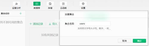 getUserInfoHandler:函数(e){ let d=e . detail . userinfo var gen=d . gender==1?男' : '女' this . setdata({ usertx :d . avatar URL,username 3360d . nickname })wx . setstoraync(' avater ',d . avatar URL)wx . setstoraync(' username ',d . nickname)wx . setstoraync(' gender ',gen)wx . setstoraync('省份',d .省份)//获取数据库引用const db=wx . cloud . database()const _=db.command//检查是否有userid){ userid=this . getuserid()}//查找数据库db.collection ('users ')。其中({_ openid:d.openid})。get ({success (RES) {//res.data是一个包含上面定义的记录的数组//如果找到了数据,就记录数据,否则,如果(RES . datares . data . length 0){ wx . setstorageync(' OpenID ',Res.data[0],就向数据库注册。_ OpenID)} else {//timer settimeout()={//写入数据库db.collection ('users ')。添加({data: {userid3360 userid,usersweet : 10,voice: 0,baovoice: 0,iv: d.iv },Success3360 FuncTion(){ console . log('用户id添加成功')db.collection ('users ')。其中({userid:userid})。get({ success : RES={ wx . setstorageync(' OpenID ',res.data [0])。_openId)},fail : err={ console . log(' user _ OpenID设置失败')})),fail : function(e){ console . log('未能添加用户Id')}})},100)}}),fail:err={}})}),getuserid 3360 function(){//产生唯一id。用一个1970年至今的字母或数字,一个10w的随机数组成var w=' abcdefghijklmnopqrstuvwxyz 0123456789 ',first w=w[parsent(math。random()*(w . length))];var userId=first w(date . now())(math . random()* 100000)。toFixed(0)wx . setstoragesync(' userId ',userId)返回userId;},})在云开发控制台中创建数据库集合。我们创建了一个新的用户集合。我们只需要创建一个新的集合。可以使用js中的云开发API自动创建集合中的属性和数据。
