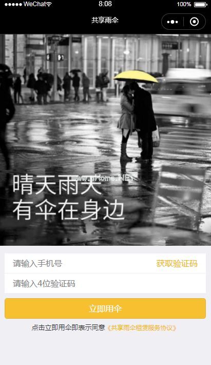 !-页面/寄存器/寄存器。wxml-scroll-view image src='/images/register。' png ' mode=' width fix ' class=' topImage '/image view class=' input-top ' input id=' telphone ' maxlength=' 11 ' type=' text ' placeholder='请输入手机号绑定输入=' inputPhoneNum '/text wx : if=' { {!send } } ' bind tap=' send msg ' class=' send msg '获取验证码/text text wx : if=' { { send } } ' class=' send msg ' bind tap=' send msg ' {第二个} }/text/view view class=' input-button ' input id=' captcha ' type=' number ' maxlength=' 4 ' placeholder='请输入四位验证码bind input=' input code '/view button class=' BTN ' open-type=' getUserInfo ' bind getUserInfo=' ongotserinfo ' lang=' zh _ CN '立即用伞/button view class=' protocol ' text class=' protocol-left '点击立即用伞即表示同意/text text class=' protocol-right ' 《共享雨伞租赁服务协议》/text/view/scroll-view 3、wxss代码