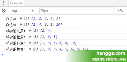 var a=[1,2,3,4,5]var b=[2,4,6,8,10]console.log('数组a:',a);console.log('数组b:',b);console.log('a与b的交集:',Array.intersect(a,b));console.log('a与b的差集:',数组。减(a,b));console.log('a与b的补集:',Array.complement,b));console.log('a与b的并集:',Array.union(a,b));(3)运行结果同上面一样。
