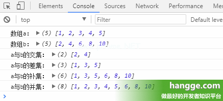 var a=[1,2,3,4,5]var b=[2,4,6,8,10]console.log('数组a:',a);console.log('数组b:',b);var sa=新集合(a);var sb=新集合(b );//交集让intersect=a . filter(x=sb。has(x));//差集让减=a.filter(x=!某人有);//补集字母补码=[.a.filter(x=!某人有),b.filter(x=!sa。has(x))];//并集让unionSet=Array.from(新集合([.一个,b]));console.log('a与b的交集:',intersect);console.log('a与b的差集:',减);console.log('a与b的补集:',补语);console.log('a与b的并集:',UnionSet);运行结果还是一样: