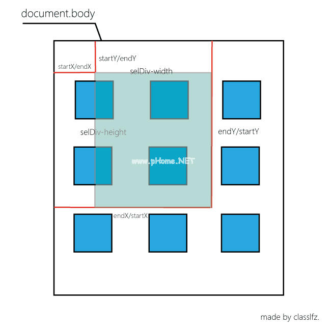 当按下鼠标左键时,鼠标移动时会出现一个矩形框;松开鼠标左键,根据上面出现的矩形选中框,统计选中框内的DOM元素;嗯(表示踌躇等).上面的功能描述看起来相当简单,但是在实现的时候还是有一些地方需要考虑。例如,如果我们的框选择范围不是document.body,而是div呢?在实际开发过程中,我们应该会遇到第二种情况。