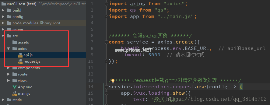 首先在vue-cli项目的src路径下新建一个axios文件夹,在axios文件夹中创建aps.js和request.js。用api.js写接口,axios的包用request.js写,项目组织如下: