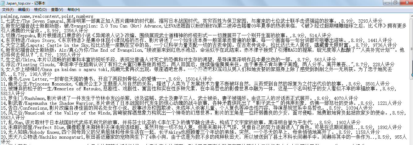 从bs4导入请求导入美丽的soupimport重新导入CSV #定义爬网函数defget _ infos (htmls,csvname) : #标头头={ ' user-agent ' : ' Mozilla/5.0(windows nt 6.1;Win64X64)苹果WebKit/537.36 (khtml,喜欢壁虎)chrome/65 . 0 . 3325 . 181 safari/537.36 ' } #标志写文件时,判断是否是第一行标志=True #并判断第一页URL。如果I==0: html=html LSE 3360 html=html ' index-{ },则第二页及以下各页的网址为I在(10) :范围内。html。格式(str(I(1))RES=请求。get (html,headers=headers)shoot=beautulsoup(RES . text,Lxml ')all=shoot。选择(' # asynchratingregion li ')#选择网页的Li节点的内容#循环浏览该节点的内容以获得all in all s : paiming=one . div . em . string # Rank name=str(一。选择(' div。mov _ pic a ')#电影名称并字符串列表名称=re.findall '。*?title='(。*?)'.*?名字,re。S)[0] #使用正则表达式提取内容内容=str(一。选择(' div。mov _ con p . mt3’)# comment real content=re . find all('。*?mt3 '(。*?)/p ',内容,re。S)[0] #与P1相同=one.find (name=' span ',attrs={'class' :' total'},text=re.compile(' \ d ')#在两个节点得分,p2=one Attrs={ ' class ' : ' total 2 ' },text=re.compile('。\ d ')#如果p1和p2,判断分数是否为空!=none : P1=P1 . string p2=p2 . string else : P1=' no ' p2=' point ' point=p1p 2 '分钟' numbers=one . find(text=re.compile(' score '))# score number # Save as CSV csvnames=' c : \ \ users \ Lenovo \ desktop \ \ ' csvname '。带有open (csvnames,' a ',编码='utf-8 ')作为f : writer=CSV . writer(f)if flag : writer . writerow((' paiming ',' name ',' realcontent ',' point ',' Numbers ')writer . writerow((paiming,name,realcontent,point,Numbers)) flag=False#调用函数Japan _ html=' http://www.mtime.com/top/movie/top100 _ Japan/' csvname 1=' Japan _ top ' get _ infos(Japan _ html,Csvname1) Korea _ html为了防止这种情况发生,