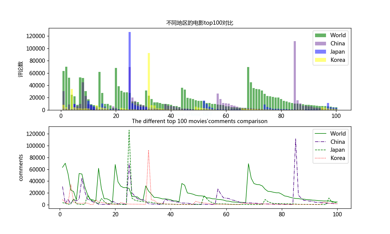 从matplotlib导入CSV导入pyplot作为PLT #中文乱码处理PLT . rcparams[' font . sans-serif ']=[' Microsoft yahei ']PLT . rcparams[' axes . unicode _减']=false defread _ CSV(csvname): cvfile _ name=' c : \ \ users \ Lenovo \ desktop \ \ ' csvname '。CSV' #打开文件并将其保存在列表中,打开时(csvfile_name,Encoding=' utf-8 ')为f : reader=CSV . reader(f)header _ row=next(reader)name=[]为reader :名称中的行。append (row) #将列表中的非空元素real=[]用于名称3360中的I if len(I)!=0: real.append(i) #移除中文并将数据转换为shaping t=0ss=[]用于real3360ss中的j。追加(int(real[t][4][:-5])t=1 return ss #制作对比图All_plt=read_csv('bs1') #调用函数China _ PLT=read _ CSV(' China _ top ')Japan _ PLT=read _ CSV(' Japan _ top ')Korea _ PLT=read _ CSV(' Korea _ top ')Shu=list(range(1,101)) FIG=PLT。图(DPI=128,图大小=(10,6)) #设置图形界面PLT。SUPLOT (2,1,1) PLT。BAR (Shu,all _ PLT,align='' Label='World ',alpha=0.6) #绘制图形,align指定横坐标在中心,color,alpha指定透明度PLT.bar (shu,China _ PLT,color=' indigo ',label=' China ',alpha=0.4) #绘制图形,color,Label属性用于显示图例标签plt.bar (shu,Japan _ PLT,color=' blue ',label=' Japan ',alpha=0.5) #绘制图形,color,PLT.bar(Label='Korea ',alpha=0.5) #绘制图形,颜色,plt.ylabel('评论数',fontsize=10) #纵坐标标题,字体大小plt.title('不同地区top100电影对比',Fontsize=10) #图形标题plt。 图例(loc='最佳')PLT。绘制(2,1,2) PLT。plot (shu,all _ PLT,线宽=1,c=' green ',label=' world') #绘制图形并指定label属性用于显示图例标签PLT。地块(shu,China _ PLT,线宽=1,c=' indigo ',label=' China ',ls='-')#绘制图形并指定线宽和颜色。plt.plot(shu,Japan_plt,line width=1,c=' green ',label=' Japan ',ls='-') #绘制图形,指定线宽和颜色,plt.plot (shu,Korea _ plt,Line width=1,c=' red ',label=' Korea ',ls=Color,PLT.ylabel ('comments ',fontsize=10) #纵坐标标题,字体大小PLT.title('前100部不同电影' comments comparison ',Fontsize=10) #图形标题PLT。图例(LOC=“最佳”)“PLT”。图例()—— LOC参数选择“最佳”: 0、#自动选择最佳位置“右上”3360 1、“左上”: 2、“左下”: 3、“右下”: 4、“右下”: 5、“左中”: 6、“右中”: 7、“下中”: 8、“上中”: 9、“中”: 10、“”save fig(' c : \ \ users \ Lenovo \ desktop \ \ bs1 . png ')# save pictures PLT . show()# display graphics在这里需要注意的是,保存的csv文件会被读取并显示出来每个电影数据都是一个列表(先称之为有效列表),每个有效列表的前后都有一个空列表,所以在进行下一步之前有必要删除这个空列表