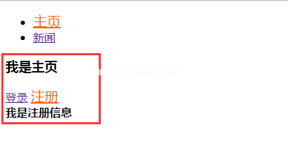 !DOCTYPE html html lang=' en ' head meta charset=' UTF-8 ' title document/title script src=' http : bower _ components/vue/dist/vue。js '/script script src=' http : bower _ components/vue-router/dist/vue-router。js '/脚本风格.v-link-active { font-size : 20px;color : # f60 }/style/head body div id=' box ' ul阿利v-link='{path:'/home'} '主页/a /li阿利v-link='{path:'/news'} '新闻/a /li /ul分区路由器-视图/路由器-视图/div /div模板id='home' h3我是主页/H3 div a v-link=' { path : '/home/log in ' } '登录/a a v-link=' { path : '/home/reg ' } '注册/a/div/路由器-视图/路由器-视图/div/模板模板id='news' h3我是新闻/H3/模板脚本//1。准备一个根组件var App=Vue。extend();//2.国内新闻组件都准备var Home=Vue。扩展({模板: ' # Home ' });var News=vue。扩展({ template : ' # News ' });//3.准备路由var router=new VueRouter();//4.关联路由器。map({ ' home ' : { component : home,subroute 3360 { ' log in ' : { component : { template : ' strong我是登录信息/strong' } }、“reg”: { component : { template : } strong我是注册信息/strong' } } } },' news ' : { component : news } });//5.启动路由router.start(App,' # box ');//6.跳转路由器。重定向({“/”:“home”});/脚本/正文/html效果图: