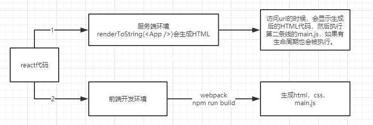 这个业务流程图很清晰。服务器只生成HTML代码,但实际上前端会生成一个main.js供服务器在HTML中使用。这就是react ssr的工作流程。用这个图会更好理解。如果这个业务没有理解清楚,下面的估计就很难理解了。