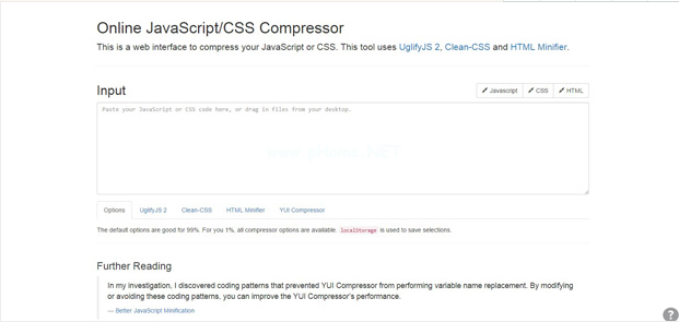 这是一个压缩你的Java Script语言或半铸钢钢性铸铁(Cast Semi-Steel)的网页界面。这个工具使用UglifyJS 2,Clean-CSS和超文本标记语言迷你程序.
