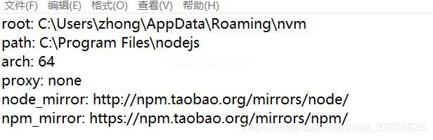root: C: \用户\钟\应用数据\漫游\nvm路径: c : \程序文件\ nodejs arch : 64 proxy : none node _ mirror : http://npm.taobao.org/mirrors/node/npm_mirror:https://npm.taobao.org/mirrors/npm/