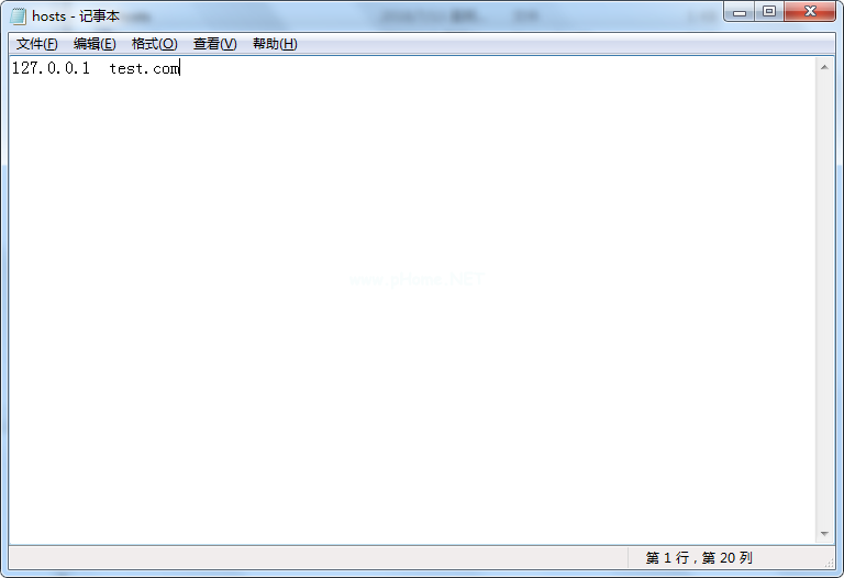 第四步是设置本地计算机的Host文件,并配置本地域名test.com。让浏览器识别test.com域名指向本地计算机。(这一步非常关键,否则你会被告知无法通过在浏览器中键入test.com来解析。)
