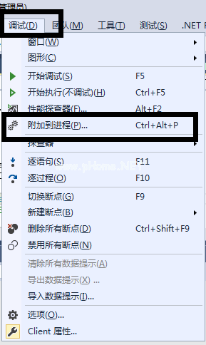 第六步如果在test.com网站测试中发现了相应的问题,我们可以通过附加IIS进程来调试网站。当然,调试的方式和以前不一样。此时,不要直接点击Visual Studio中的调试按钮或F5进行调试。我们可以通过以下方式进入调试模式,选择菜单栏上的Debug,打开子菜单,选择Attach to Process,如下图所示(当然也可以通过快捷键Ctrl Alt P直接拉出附加界面)