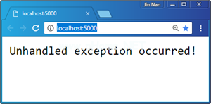 公共类Program { public static void Main(){ request delegate handler=async context=wait context。响应。WriteAsync('出现未处理的异常!');新的WebHostBuilder()。UseKestrel()。配置(app=app。UseExceptionHandler(新的ExceptionHandler选项{ ExceptionHandler=handler})。运行(上下文=任务。FromException(新的InvalidOperationException('手动引发的异常. '))))) .构建()。run();}}如上面的代码片段所示,这个作为异常处理程序的RequestDelegate只是发送了一个简单的错误消息(“发生了未处理的异常!”)作为响应的内容。当我们使用浏览器访问应用程序时,这个定制的错误消息将以图4所示的形式直接显示在浏览器上。