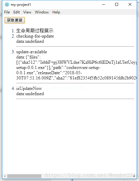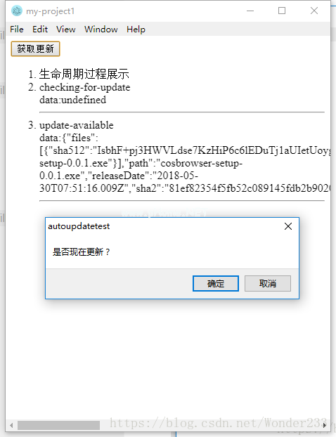 模板div id='app '!-router-view/router-view-button @ click=' auto update()'获取更新/button ol id=' content ' lilife cycle process presentation/Li/ol/div/template script//从' electronic '导入{IPC渲染器};const { ipcRenderer }=require(' electron ');导出默认{ name: 'my-project1 ',已装入(){ var _ ol=document . getelementbyid(' content ');ipcRenderer.on('message ',(event,{message,data })={ let _ Li=document . create element(' Li ');_ Li . innerhtml=message ' brdata : ' JSON . stringify(data)' HR ';_ ol . appendchild(_ Li);If(消息===' isupdatow '){ if(确认('立即更新?)){ ipcrenderer . send(' updateNow ');} } });},methods : { autoUpdate(){ ipcrenderer . send(' update ');} }};/scriptstyle/* CSS *//style显示如下界面: