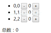 div class=' count 3 ' ul Li v-for='(key,idx)in LiLiST ' : key=' key . id ' { key . id } },{ { idx } } template button class=' cut ' @ click=' cuts(idx)'-/button span { { key . num } }/span button class=' add ' @ click=' add(idx)'/button/template/Li/ul total:{ { total } }