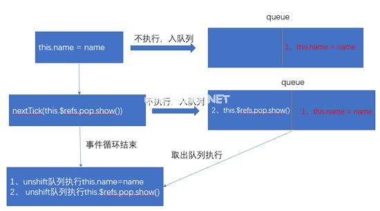 也就是说,当我们在父组件中设置this.name=name时,vue不会直接更新到子组件中(dom update也不会立即执行),而是将所有这些更新操作放入一个队列中,同一组件的所有这些赋值操作都将作为一个观察器的更新操作放入这个队列中,然后当事件循环结束时,将一次从这个队列中获取所有wath cher来执行更新操作。在我们的例子中,当我们调用show时,实际上,我们的this.name=name并没有真正执行,而是被放入队列中。这种vue的方法无疑是基于优化的,否则,如果在有N个赋值vue的情况下进行N次dom更新,效率将会非常低,而且不理想。