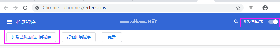 B.打开扩展程序后,打开开发人员模式,单击按钮加载解压缩的扩展程序