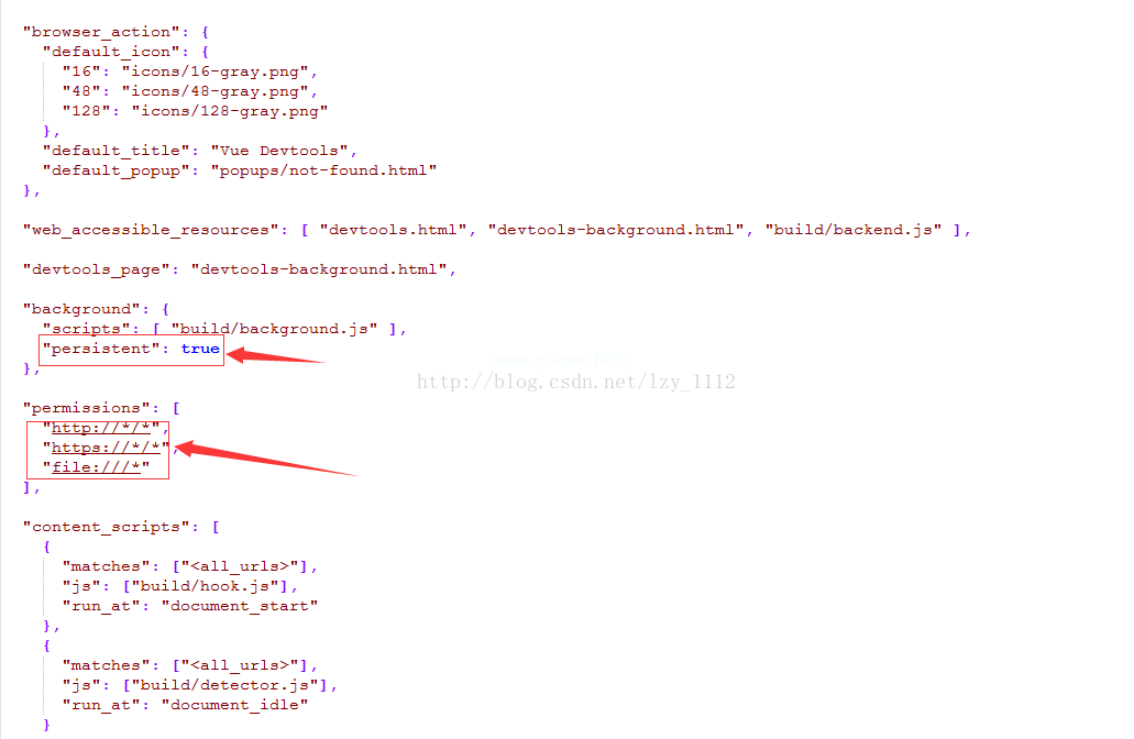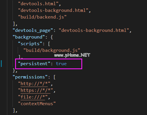 3.修改安装目录vue-dev tools \ shell \ chrome中的manifest.json文件。将持久性参数更改为true,如下图所示: