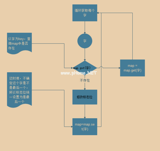 每个字符都是一个节点,连续的节点组成一个单词。日本人对应的是中链。我们可以用物体或地图来建造树木。在这里,栗子使用map来构建节点,每个节点都有一个状态标识符来指示当前节点是否是最后一个节点。每个链接必须有一个结束节点。首先看构建节点的流程图。