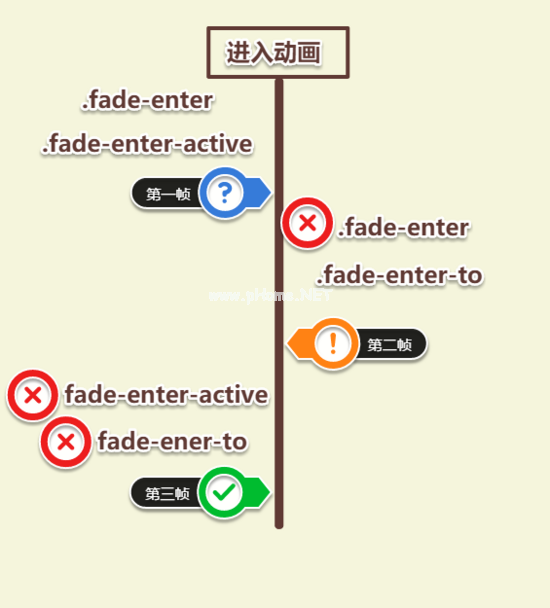 div按钮@click='show=!Show' show toggle/button过渡名称=' fade '/fade自定义名称p v-if=' show ' hello/p/transition/div style . fade-enter-active { transition :不透明度. 5s;//类名:隐藏显示进程所需的时间}。淡入{//类名:初始化状态opa city 3360 0;}/style自己画了一个过渡动画生命周期,表示:动画开始、过程、结束、类名有效和无效