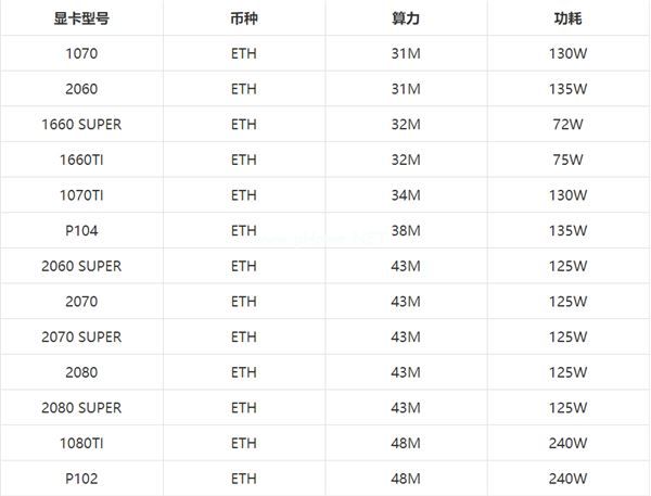 NVIDIA显卡挖以太坊(ETH)算力排行榜: