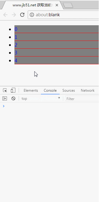 !doctype html html lang=' en ' head meta charset=' UTF-8 ' meta name=' Generator ' content=' EditPlus ' meta name=' Author ' content=' meta name=' Keywords ' content=' meta name=' Description ' content=' titlewww.jb51.net获取当前点击的元素在原来集合中的索引/title style type=' text/CSS ' Li { height : 25px;线高: 25pxbackground: rgba(0,0,0,0.5);边框-底部: 1px纯红;} a { text-decoration : nonefont-size : 16px}/样式/头体div ul阿利href=' JavaScript : void(0);rel='外部nofollow ' rel='外部nofollow ' rel='外部nofollow ' rel='外部no follow ' div class=' index ' 0/div/a/Li阿利href=' JavaScript : void(0);rel='外部nofollow ' rel='外部nofollow ' rel='外部nofollow ' rel='外部no follow ' div class=' index ' 1/div/a/Li阿利href=' JavaScript : void(0);rel='外部nofollow ' rel='外部nofollow ' rel='外部nofollow ' rel='外部no follow ' div class=' index ' 2/div/a/Li阿利href=' JavaScript : void(0);rel='外部nofollow ' rel='外部nofollow ' rel='外部nofollow ' rel='外部no follow ' div class=' index ' 3/div/a/Li阿利href=' JavaScript : void(0);rel='外部nofollow ' rel='外部nofollow ' rel='外部nofollow ' rel='外部nofollow ' div class=' index ' 4/div/a/Li/ul/div脚本src=' http :http://libs。百度。com/jquery/2。0 .0/jquery。量滴js /脚本类型=' text/JavaScript ' $(function(){ $().索引')。on('click ',function(){ var $ target=$(this);console.log($(').索引')。指数($ target));});});/脚本/正文/html使用在线HTML/CSS/JavaScript代码运行工具http://tools.jb51.net/code/HtmlJsRun测试运行结果如下: