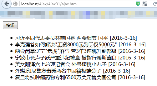 正文输入id='btn '类型='按钮'值='按钮/ul id='ul1 '获取新闻到该处/ul脚本src=' http : JSON。js '/script script src=' http : Ajax。js '/script/body xhr。开(‘得到’,‘getNews.php’,真);xhr。setrequestheader('内容类型',' application/x-www-form-URL编码');xhr。send();xhr。onreadystatechange=function(){ if(xhr。readystate==4){ if(xhr。status==200){ var data=JSON。解析(xhr。response text);varoUl=文档。getelementbyid(' ul1 ');var html=//DOM操作,把服务器取回的内容显示在网页上for(var I=0;idata.lengthi ) { html='阿利herf=' ' '数据[i].标题/a[span]数据[i].日期/span/Li ';} oUl.innerHTML=html}else{ alert('出错了,err : ' xhr。地位);} }}取回数据的页面: