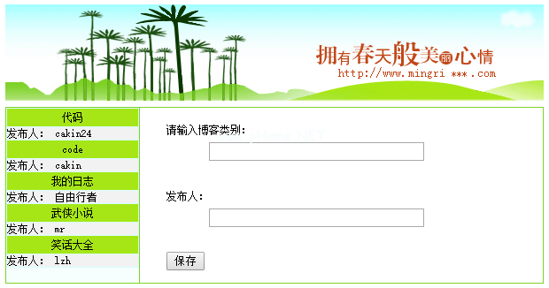 ?曾经的conn.php?DOCTYPE html PUBLIC '-//W3C//DTD XHTML 1.0 Transitional//EN ' ' http://www .w3。org/TR/XHTML 1/DTD/XHTML 1-Transitional。DTD ' html xmlns=' http://www .w3。org/1999/XHTML ' hearteta http-equiv=' Content-Type ' Content=' text/html;charset=GB 2312/title添加类别/titlelink rel='样式表type=' text/CSS ' href=' CSS/style。CSS ' rel=' external no follow ' rel=' external no follow '/head脚本语言=' JavaScript ' src=' http : js/fun。js '/脚本正文表边框=' 0 ' align=' center ' cell padding=' 0 ' cell spacing=' 0 ' tr tdimg src=' http 3360 images/banner。gif ' width=' 608 ' PHP $ SQL=MySQL _ query('通过addtime desc从tb _类型订单中选择typename、username ',$ ConnID);$ result=MySQL _ fetch _ array($ SQL);if ($result){ do{?tr TD bgcolor=' # a6e 617 ' height=' 20 ' div align=' center ' a href=' # ' rel=' external nofollow ' rel=' external nofollow ' class=' a1 '?=$result['typename']?/a/div/TD/tr TD bgcolor=' # F2F2F 2 '高度='12'div align='left '发布人:=$result['username']?/a/div/td /tr?PHP } while($ result=MySQL _ fetch _ array($ SQL));}其他{?tr td bgcolor='#A6E617 '高度='20 '暂无文章类别/td /tr?php }?/table/TD TD width=' 455 ' bgcolor=' # FFFFFF ' style=' padding-left :30 px;线高' :25px '请输入博客类别:br /输入类型=' text ' name=' typename ' size=' 30 ' id=' typename '/br/br/发布人:br /输入类型=' text ' name=' username ' size=' 30 ' id=' username '/br/br/输入类型='按钮'值='保存onclick=' SaveType(类型名。值,用户名。value)'//TD/tr/table width=' 200 ' height=' 7 ' border=' 0 ' align=' center '单元格填充=' 0 '单元格间距=' 0 ' tr TD/TD/tr/table width=' 608 ' height=' 70 ' border=' 0 ' align=' center '单元格填充=' 0 ' tr TD background=' images/bottom。gif ' DIV align='居中' DIV align='居中'博客』 版权所有a href='http://www.mingri*** .com ' rel=' external nofollow ' rel=' external nofollow ' rel=' external nofollow ' rel=' external nofollow ' class=' a1 '吉林省**科技有限公司/a!未经授权禁止复制或建立镜像!溴版权所有a href='http://www.mingri*** .com ' rel=' external nofollow ' rel=' external nofollow ' rel=' external nofollow ' rel=' external nofollow ' class=' a1 ' www .明日* * * .版权所有!BR/DIV/DIV/TD/tr/表格/正文/html二。运行结果
