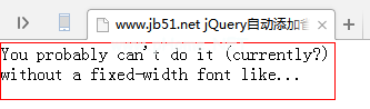 !DOCTYPE html html lang=' en ' head meta charset=' UTF-8 ' titlewww.jb51.net jQuery自动添加省略号/title脚本src=' http :http://apps。bdimg。com/libs/jquery/2。1 .4/jquery。量滴js '/script脚本类型=' text/JavaScript ' $(function(){ $().图标题').每个(函数(i) { var divH=$(this)).高度();var $p=$('p ',$(this)).eq(0);while($ p . ExternaL Height()(DivH){ $ p . text($ p . text().替换(/(\s)*([a-zA-Z0-9] |\W)(\).\.\.)?$/, '.'));};});});/script style * { padd : 0px;margin: 0px}。图标题{宽度: 300px高度: 50px/*根据父元素的高度来添加省略号*可以任意设置显示的行数*/border: 1px纯红;}/style/head body div class=' fig caption ' p你可能做不到(目前?)没有像信使那样的固定宽度字体。对于固定宽度的字体,每个字母都占据相同的水平空间,因此您可能会计算字母,并将结果乘以邮政快递或外面支撑的中的当前字体大小。然后你只需要测试一行有多少个字母,然后分解它/p /div/bodyscript/script/html运行效果: