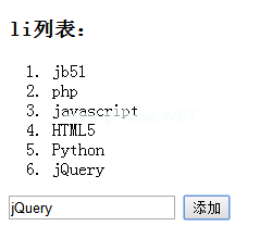 !doctype html lang=' en ' head meta charset=' utf-8 ' title www.jb51.net jquery list添加新元素/title script src=' http : jquery-1 . 7 . 2 . min . js '/script/head dyh3listlist:/h3ol lijb 51/Li liphp/Li lijavascript/Li litml 5/Li/Ol输入类型=' text' id=' text '输入类型=' button' id=' BTN '值=' add' script类型=' text '单击(function () {$ ('ol '))。追加});});/script/body/html对jQuery比较感兴趣的读者,可以查看本网站的主题:《jQuery常见事件用法与技巧总结》、《jQuery页面元素操作技巧汇总》、《jQuery常用插件及用法总结》、《jQuery扩展技巧总结》、《jQuery常见经典特效汇总》、《jQuery动画与特效用法总结》和《jquery选择器用法总结》。