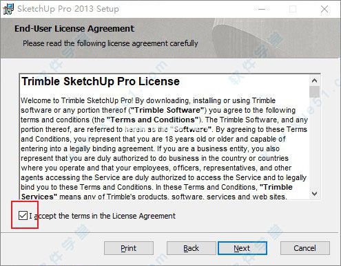1.双击运行SketchUpProWEN.exe程序开始安装软件,进入安装界面,选中该框,并同意软件相关许可协议